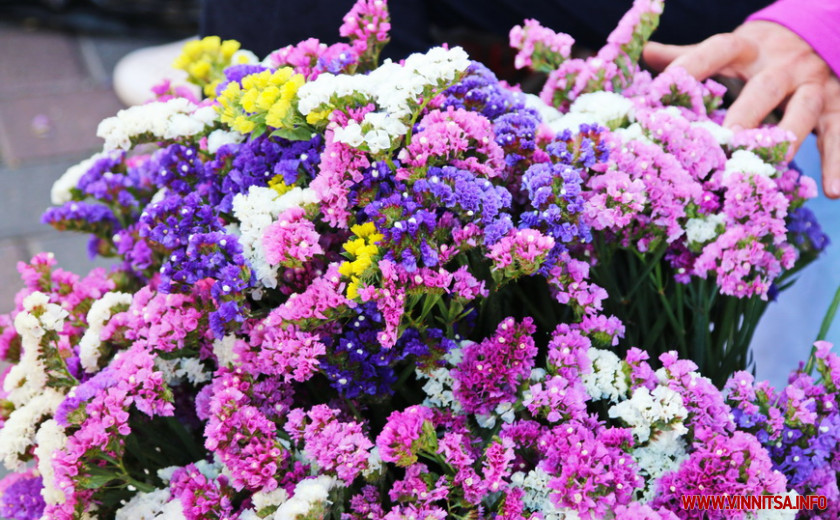 Продають квіткові композиції біля магазину «Варшава». Кілька дясятків жінок принесли на продаж яскраві букетики. Ціни коливаються від 5 до 50 гривень. Продають також випічку з маком і фрукти.