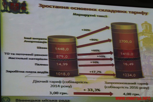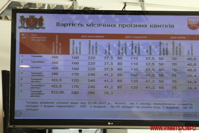 Востаннє вартість проїзду в громадському транспорті міста підвищували в 2014 році. Так, з 1 липня проїзд в трамваях і тролейбусах Вінниці становитиме 3 гривні, в муніципальних автобусах – 3,5 гривень, проїзд в маршрутних таксі – 4 гривні. 3,5 гривень коштуватиме проїзд в маршрутках на підвізних маршрутах (там де зараз 2,5 гривень – ред..)