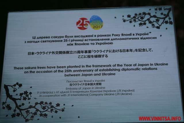 3 листопада у Вінниці біля пам'ятника жертвам Чорнобильської трагедії висадили 70 сакур. Три дерева посадили Надзвичайний та Повноважний посол Японії в Україні Шігекі Сумі, голова міської ради Сергій Моргунов та голова ОДА Валерій Коровій.