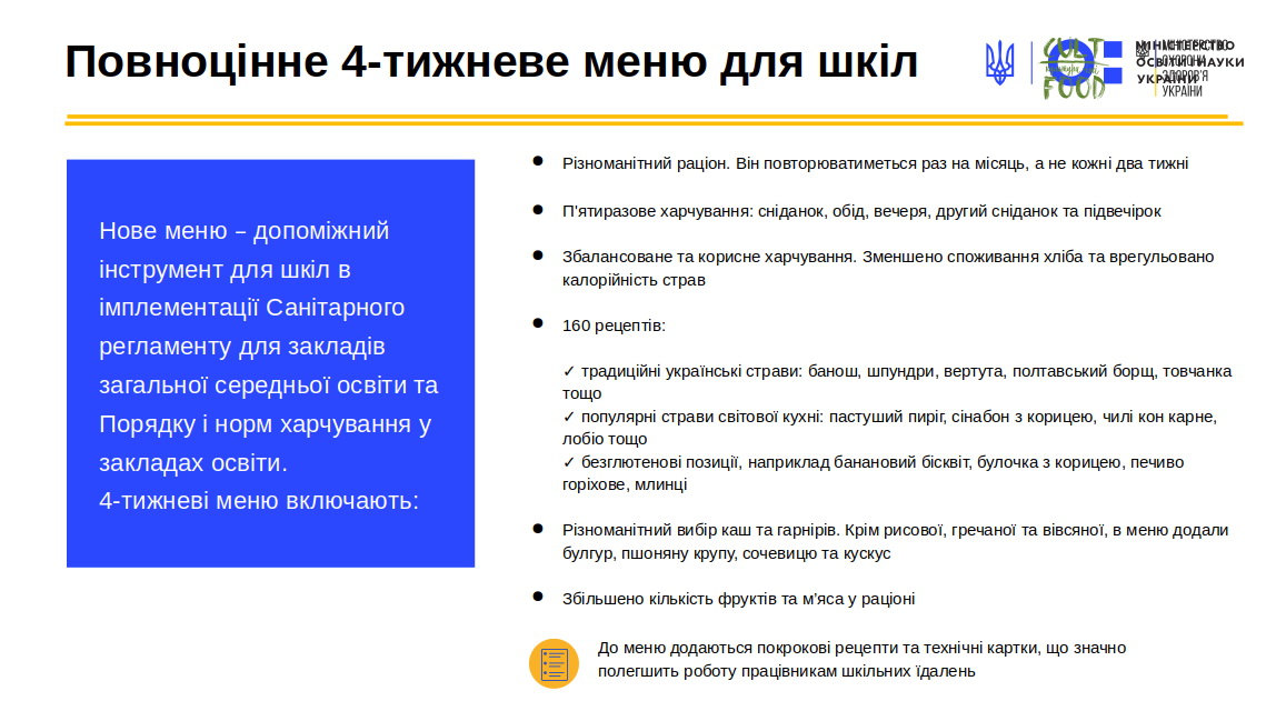 «У меню шкільних їдалень з’являться традиційні українські страви, популярні страви різних кухонь світу, а також безглютенові позиції, буде збільшено кількість фруктів та м’яса в раціоні. До меню додаються покрокові рецепти та технічні картки, що значно полегшить роботу працівників шкільних їдалень», – розповів Євген Клопотенко.
