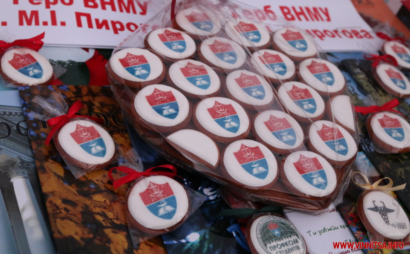 «У нас герб – це повністю імирне печиво. Наші дівчата самі його робили, заливали глазур’ю. Ми зробили маленькі пряники з гербом, та один великий суцільний. Обрали імбирне печиво, тому що, це цікаво і корисно, адже воно не дуже калорійне. Виготовляли його 7 годин наші п’ятикурсниці. Символізує герб медицину, Вінницю, книги, як символ знань», - каже заступник голови ради студентського самоврядування Анастасія.
