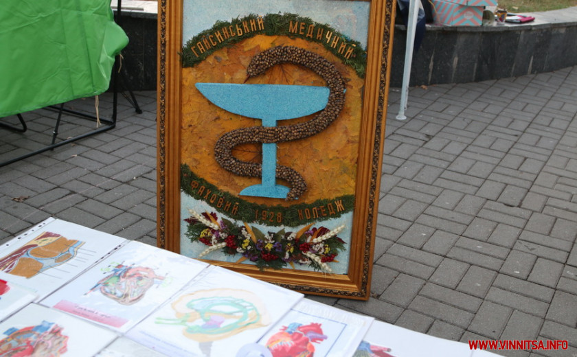 «Над гербом Гайсинського медичного фахового коледжу працювало близько 8 студентів. Хтось сушив листя, хтось збирав калину. Змія зроблена з шишок. Чаша зроблена з пінопласту, манної крупи та фарби. Все задекоровано з любов’ю до нашого коледжу. Близько тижня зайняла робота, тому, що треба було все підготовити, зібрати, засушити. Головне – фантазія. Самим основним нашим дизайнером була випускниця нашого коледжу Тищенко Діана», - зауважує практичний психолог коледжу Гуменюк Світлана Петрівна.