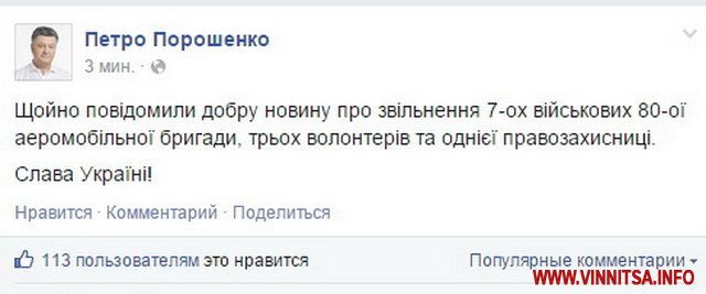 «Щойно повідомили добру новину про звільнення 7-ох військових 80-ої аеромобільної бригади. трьох волонтерів та однієї правозахисниці.