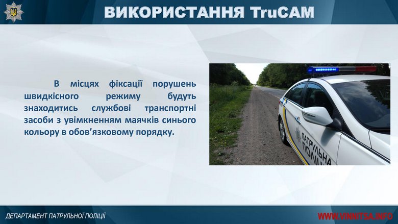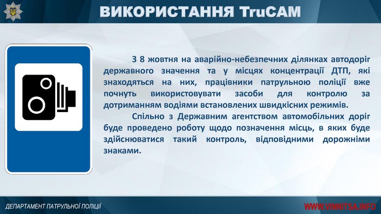 Патрульна поліція буде використовувати TruCam виключно на ділянках автодоріг із дорожніми знаками, що повідомляють про фото- відео фіксування порушень, з підвищеним рівнем аварійності, пов’язаним з перевищенням швидкості, як у містах так і на дорогах міжнародного значення.