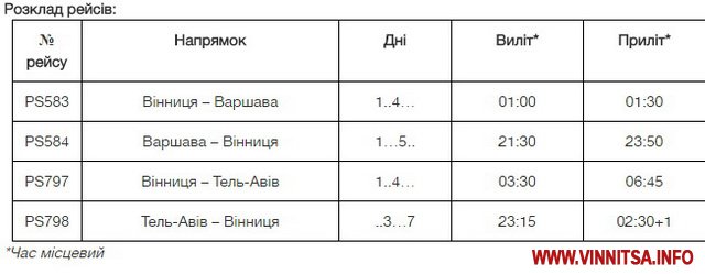 Рейси виконуватимуться на літаках «Боїнг 737» та «Ембрайєр 190». З Вінниці до Варшави почнуть здійснювати рейси 30 квітня, а з Вінниці до Тель-Авіву – з 27 березня. В обох напрямках польоти здійснюватимуть двічі на тиждень.