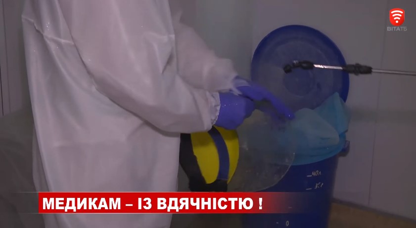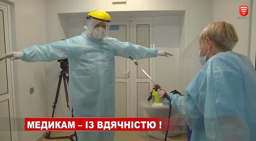 Ці ексклюзивні кадри не увійшли до жодного із сюжетів. Так знезаражують команду журналістів після зйомки в реанімації лікарні №1. З ніг до голови по кілька разів поливаючи дезрозчином. Спочатку в халатах, потім біокостюмах – стресові відео для тих, хто розуміє, що таке «мокра» апаратура.