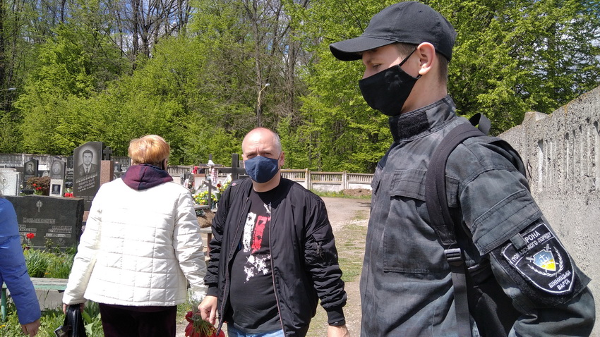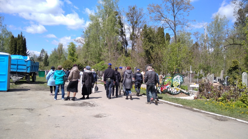 Біля входу до кладовища стоїть правоохоронець. Зауважує, що спостерігає за дотриманням правил громадського порядку з 8 ранку. Масово сходитись люди почали з дев'ятої години.