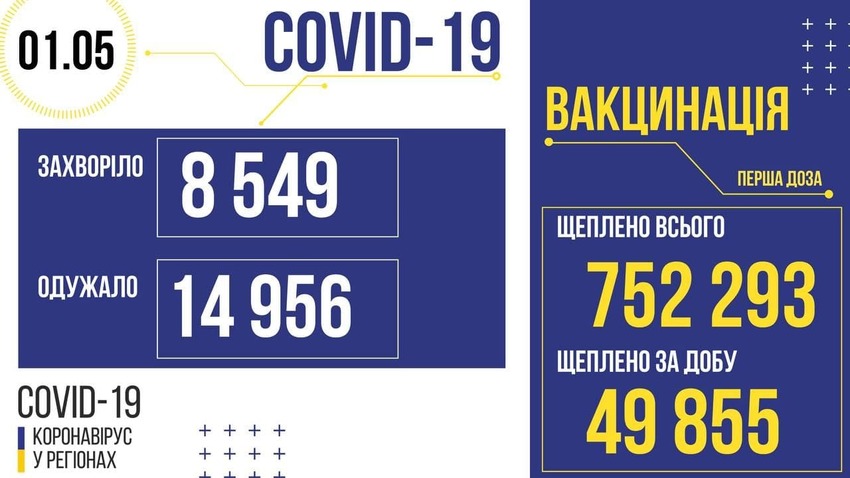 Загалом в Україні за добу одужали 14 956 людини. Захворіло - 8 549. Померли - 351. Щеплено — 49 855, а загалом проведено 752 293 вакцинації.