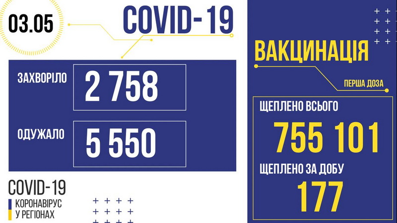 В Україні за минулу добу 2 758 нових випадків інфікувань. Одужали – 5 550 людини. Померли 154 пацієнтів. За минулу добу щеплено 177 особи.