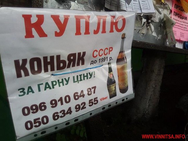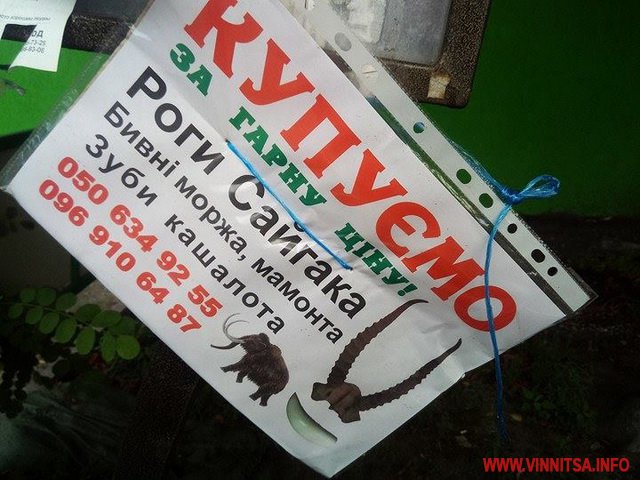 Днями на вулицях Вінниці з’явилися різнокольорові об’яви, де за дорого скуповують: коньяк СРСР до 1991 року, зуби кашалота, роги сайгака, бивні моржа та мамонта.