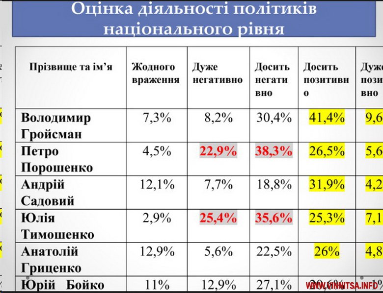 До п’ятірки лідерів позитивного сприйняття попали і керівники країни, і їх опоненти. Переконливо лідирує в позитивному ставленні вінничан прем’єр-міністр Володимир Гройсман (51%), обігнавши в цьому президента Петра Порошенка (32%). Їх критики дещо відстають, отримавши відповідно десь в межах третини прихильників: Андрій Садовий (36%), Юлія Тимошенко (32%), Анатолій Гриценко (31%).