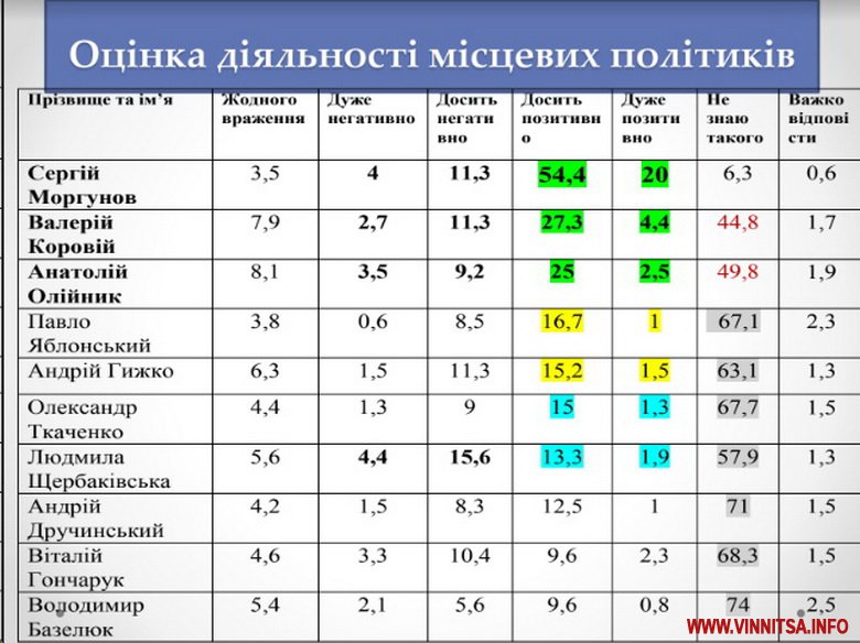 Добре впізнаваним є лише мер міста – Сергій Моргунов. При цьому ставлення вінничан до Сергія Моргунова позитивне (74%).