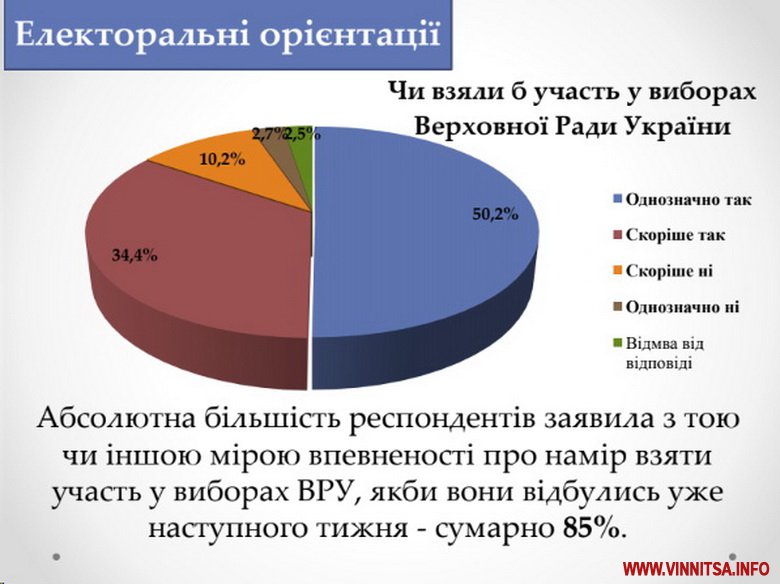 Абсолютна більшість респондентів заявила про намір взяти участь у виборах ВРУ, якби вони відбулись уже наступного тижня - сумарно 85%. При цьому, найчастіше підтримку вінничан отримували БПП (13%), Батьківщина (11%) та уявна партія Слуга Народу В. Зеленського (11%). За ними 2 політсили «Самопоміч» (7,3%) та Громадянська позиція А. Гриценка (7,3%).
