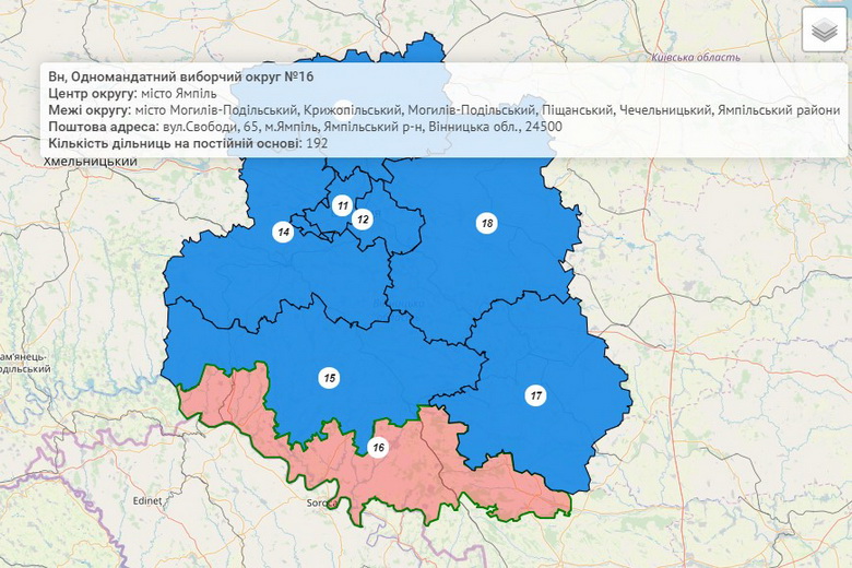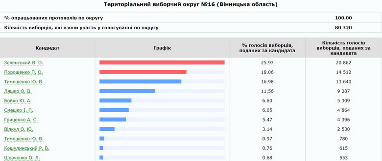 Центральна виборча комісія повністю опрацювала виборчі протоколи по округу №16 (місто Могилів-Подільський, Крижопільський, Могилів-Подільський, Піщанський, Чечельницький, Ямпільський райони). У голосуванні взяли участь 80 320 осіб.