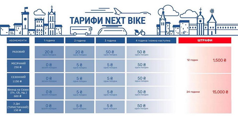 Вартість разового абонементу залишається на рівні минулого року – перша і друга година поїздки коштуватиме 20 гривень. Третя і більше – 50 гривень за одну поїздку. Вартість абонементу на місяць – 250 гривень. На весь сезон – 1150 гривень (восени вартував 800 гривень). Новий тариф «Вікенд» (п’ятниця, субота, неділя) коштуватиме 600 гривень на весь сезон. Тариф «Туристичний» на 3 дні – 150 гривень.