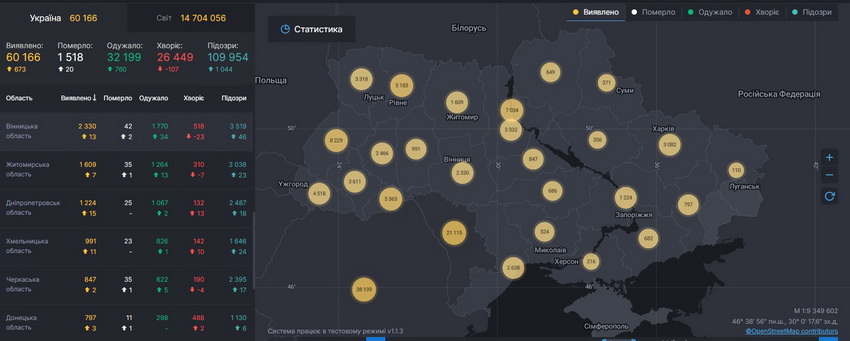 Загалом, в Україні від початку епідемії захворіли 60 166 громадян. За минулу добу хворобу підтвердили у 673 випадках. Одужали 32 199 пацієнтів. За останню добу – 760. Померли від хвороби – 1 518. За останню добу – 20.