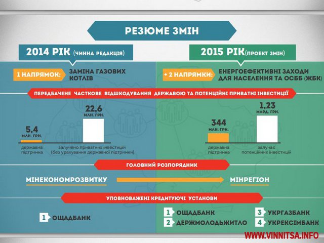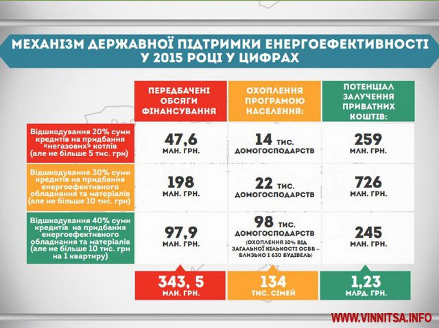 «Урядом передбачено 343 млн. грн. на цю програму, які будуть розподілені за трьома напрямками. 47,6 млн. грн. – на компенсацію придбання «негазових» котлів, 198 млн. грн. – на компенсацію коштів на утеплення індивідуальних будинків, зокрема, придбання матеріалів не покрівлю, вікна, утеплення стін та приладів обліку теплової енергії. 97,9 млн. грн. – на компенсацію придбання енергоефективного обладнання та матеріалів ОСББ», - пояснив Геннадій Зубко.