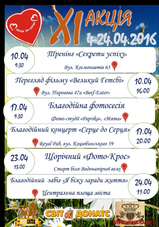 17 квітня о 9.30 пройде благодійна фотосесія у фотостудії «Paprika» та «М’ята». Також цього дня о 20.00 відбудеться благодійний концерт «Серце до серця» за адресою вулиця Коцюбинського, 39 Royal Pab. 23 квітня о 13.00 вінничан запрошують на щорічний «Фото-крос», який стартує біля Водонапірної вежі. А 24 квітня о 11.00 у місті пройде благодійний забіг «Я біжу заради життя».