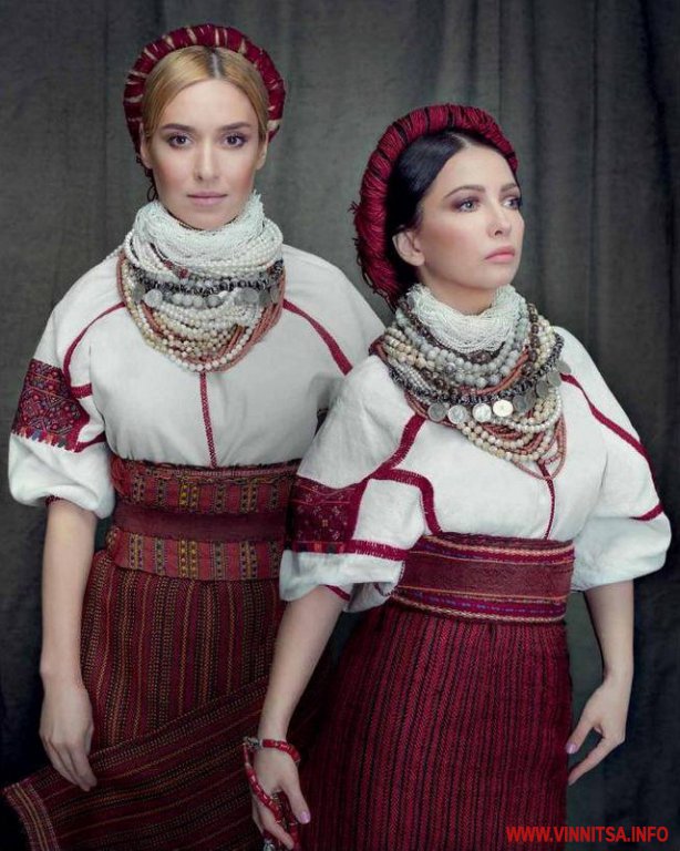 Жіноче вбрання Західного Поділля (Тернопільська область) початку XХ століття. Сорочка оздоблена бісером і розшита орлами, які оберігали жінку від злих сил. Прикраси ― стрічка-гердан із бісеру зі срібними дукачами, коралі. Головний убір викладений із герданів. Вбрана Санта Дімопулос