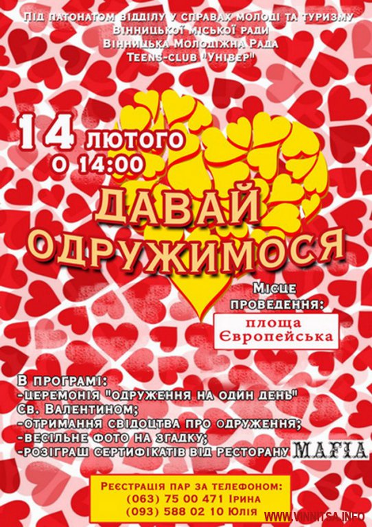 14 лютого Вінницька молодіжна рада влаштує масові заручини. Адже саме в цей день на Європейській площі пройде студентський захід «Давай одружимося», присвячений Дню Святого Валентина. Долучитися до заходу можуть всі бажаючі.