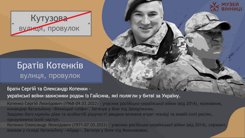Замість Кутузова – вулиця Братів Котенків. На честь українських воїнів-захисників з Гайсина, які полягли за Україну. Полковник Котенко Сергій Леонідович Герой України, під керівництвом якого наші захисники знищили кілька колон російської техніки.