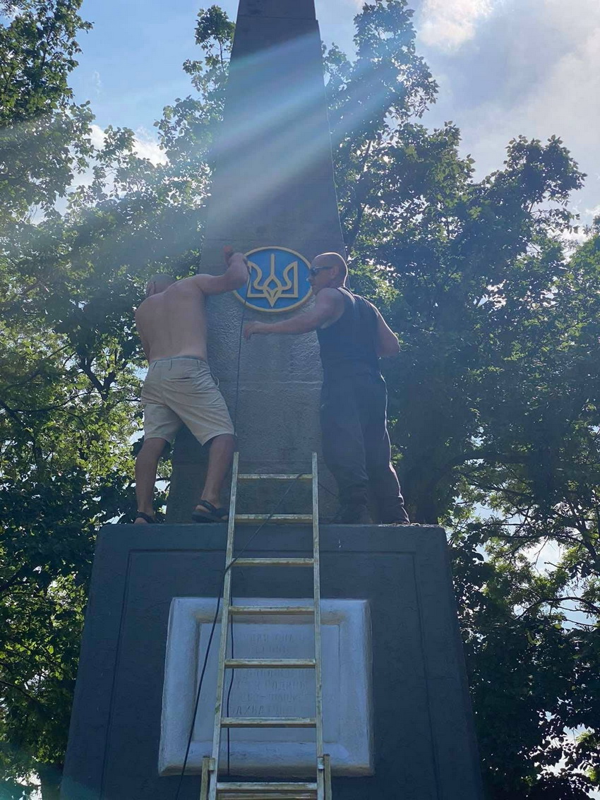 «Наприкінці травня у селі Кукавка ми вшанували загиблих воїнів УНР, які 1920 року поблизу села полягли в боротьбі за незалежність України. На стелі в пам'ять загиблим в другій світовій війні помітили, що там й досі залишилася символіка, яка підлягає декомунізації. І так співпало, що Олександр Суржиков, він мешканець Могилів-Подільського району, волонтер, знайшов у металобрухті Герб України. Не знаємо, як він туди потрапив, але був іржавий та брудний. І подумали, а чому б ним не замінити той серп та молот? Наші ветерани АТО/ООС, а саме: Віталій Тининика, Дана Українка, Геннадій Чумак та Петро Дутчак, взялися його реставрувати, пофарбували у національні кольори та встановити на стелі. Що і було зроблено», - розповів Вінниця.info Геннадій Катриченко, керівник Військово-історичного товариства "Дністер".