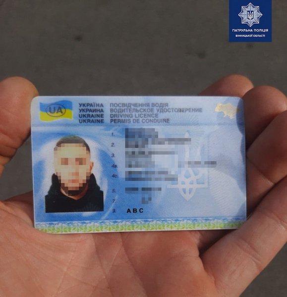 1 липня Патрульна поліція Вінницької області повідомила про те, що у обласному центрі вони перепинили чоловіка з підробленим посвідченням водія. Як з’ясувалося згодом, водій замовив права через інтернет. А справжнє посвідчення у нього вилучили ще у 2019 році, адже сів за кермо у стані алкогольного сп’яніння.