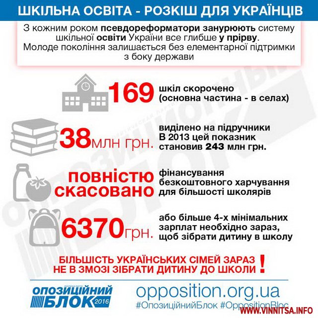 За офіційною інформацією більше 17 тисяч першокласників сядуть вперше за парти у школах Вінницької області, а їх батькам доведеться викласти з сімейного бюджету приблизно таку суму. А якщо в родини немає заощаджень, чи є менші кошти?.. От як тут не згадати страждання маленького Миколки з оповідання А.Тесленка «Школяр», який страшенно переживав, що не піде вчитись грамоти до сільської школи, бо в нього порвались чоботи, а на нові немає коштів!?