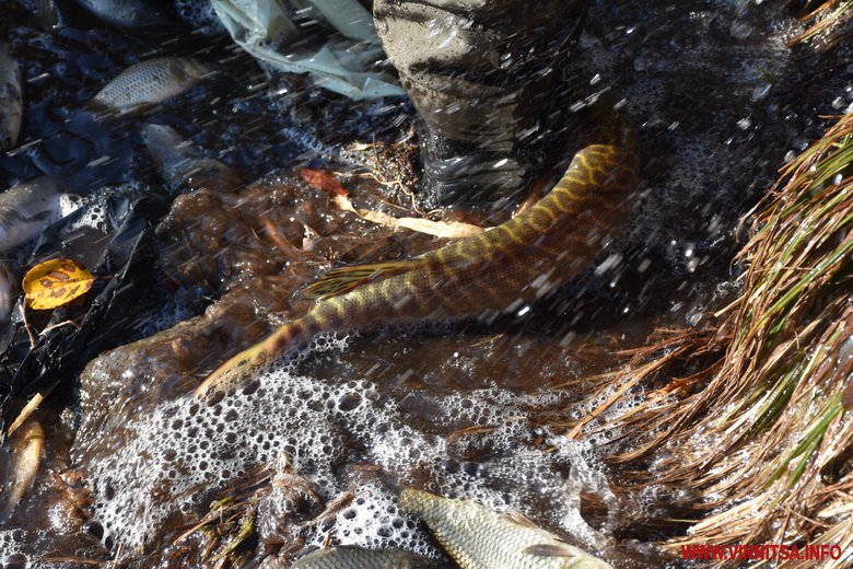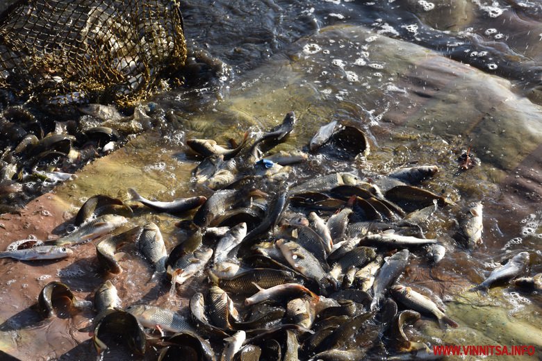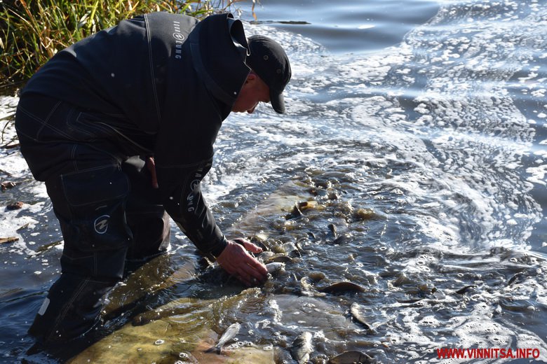 У Вінниці сьогодні в річку випустили 5 видів риб. Середня вага щуки приблизно 100-120 грам, а одного екземпляра малька рослиноїдних видів риб - близько 25-30 грам.