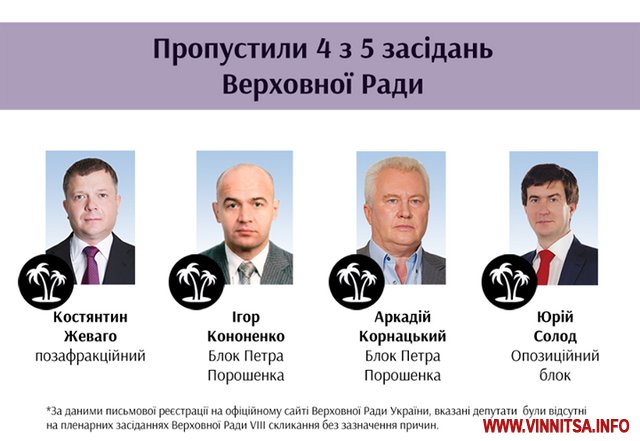 Як зазначають активісти руху, вже встиг відзначитися Костянтин Жеваго, який був рекордсменом з прогулів у Раді VI та VII скликань. На другому та третьому місцях за кількістю пропущених засідань розташувалися представники Блоку Петра Порошенка Ігор Кононенко та Аркадій Корнацький.