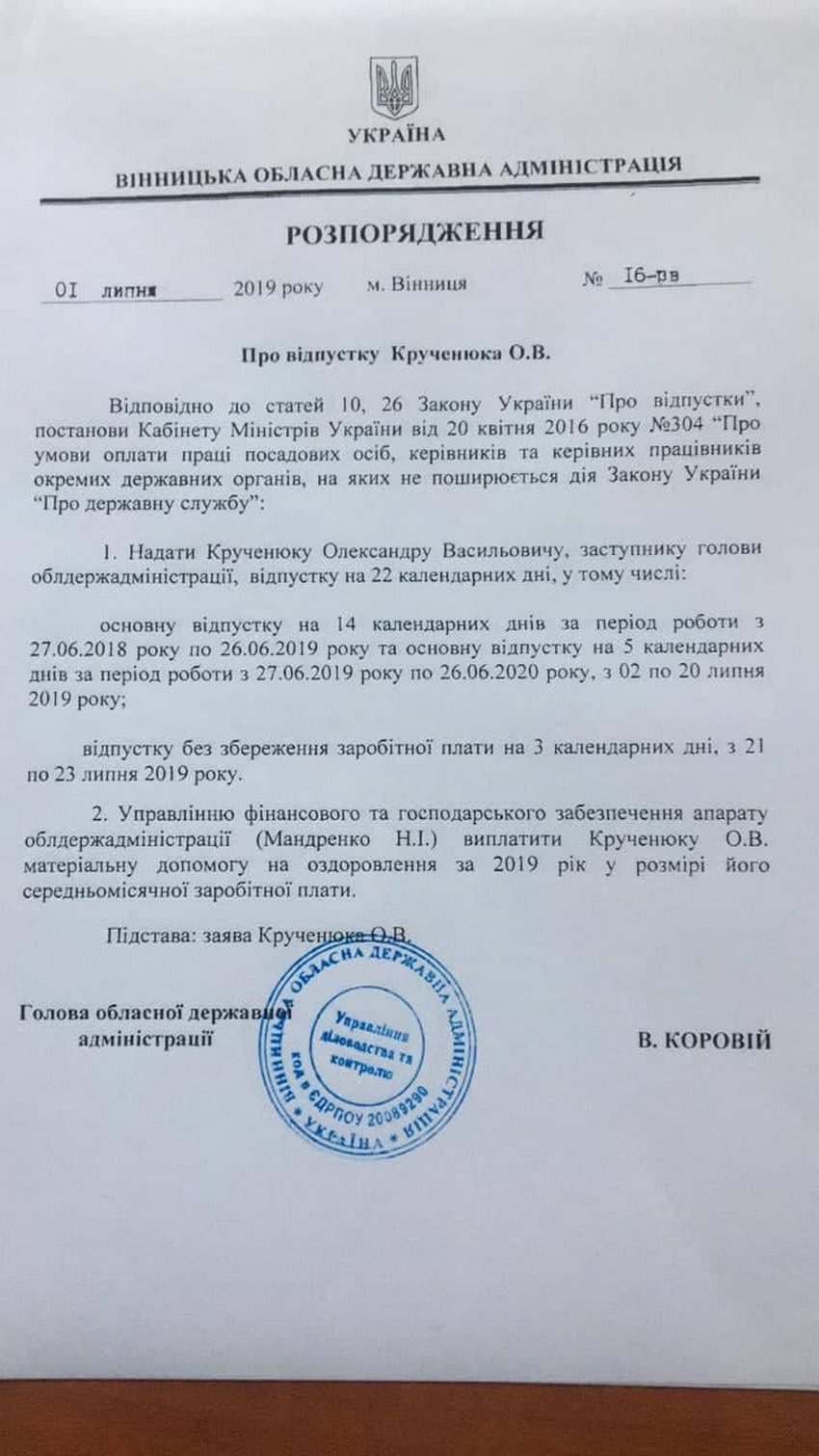 «Усім недоброзичливцям повідомляю, що з 2 липня і до дня проведення виборів включно я знаходжусь у заздалегідь запланованій щорічній відпустці, гарантованій законодавством України. Тому протягом трьох тижнів моя діяльність не буде пов’язана з виконанням обов’язків заступника голови Вінницької облдержадміністрації, – каже Крученюк, демонструючи копію розпорядження про надання щорічної відпустки, підписаної Валерієм Коровієм ще 1 липня. – Цей час планую використати для того, аби ближче познайомитися з мешканцями округу, по якому балотуюсь, і розповісти, що я зможу для них зробити як депутат Верховної Ради. Усіх кандидатів закликаю також працювати по своїх округах, ознайомлювати людей зі своїми програмами, а головне – дотримуватись чесних методів боротьби за голоси виборців».