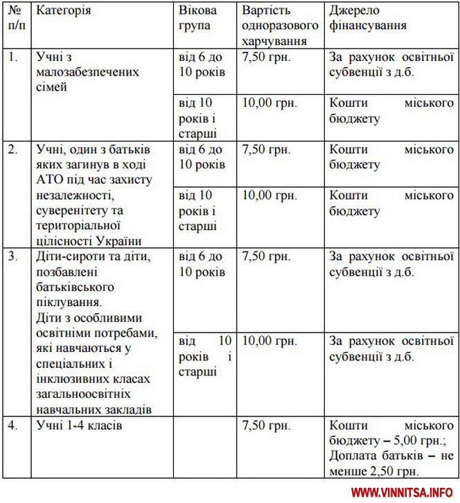 Вартість харчування учнів з числа окремих категорій дітей, учнів 1-4 класів, що навчаються в загальноосвітніх навчальних закладах міста