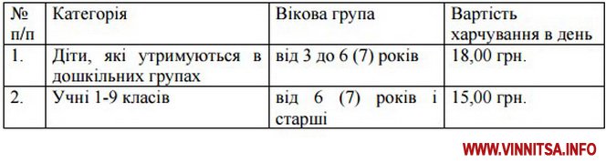 18 серпня виконком Вінницької міської ради прийняв рішення про встановлення вартості харчування для учнів 1-4 класів, дітей що навчаються і утримуються у спеціальній загальноосвітній школі І-ІІ ступенів з дошкільним відділенням. Так з 1 вересня міських бюджет, як і минулого року, виділятиме 5 гривень на школяра, однак тепер батьки зможуть самостійно покращити обіди, доплативши ще 2,5 гривні. Такі зміни були прийняті після проведення обговорень в батьківських комітетах.
