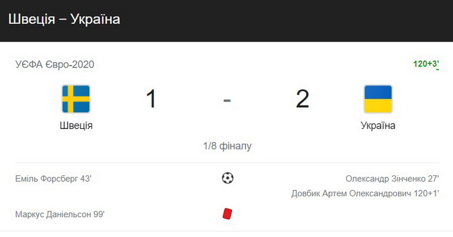 Збірна України 29 червня провела матч 1/8 фіналу Євро-2020 проти збірної Швеції. Команди грали на стадіоні «Хемпден Парк» в Глазго.