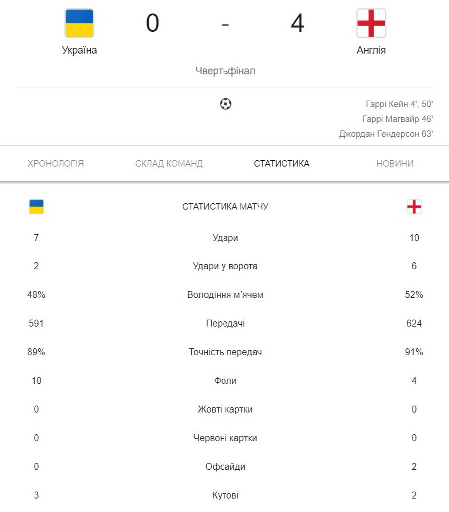 Матч завершився з рахунком 0:4 на користь Англії. Таким чином, Україна вийшла з Євро-2020 на етапі чвертьфіналу, а Англія в 1/2 чемпіонату зіграє з Данією, яка 3 липня обіграла чехів із рахунком 2:1.