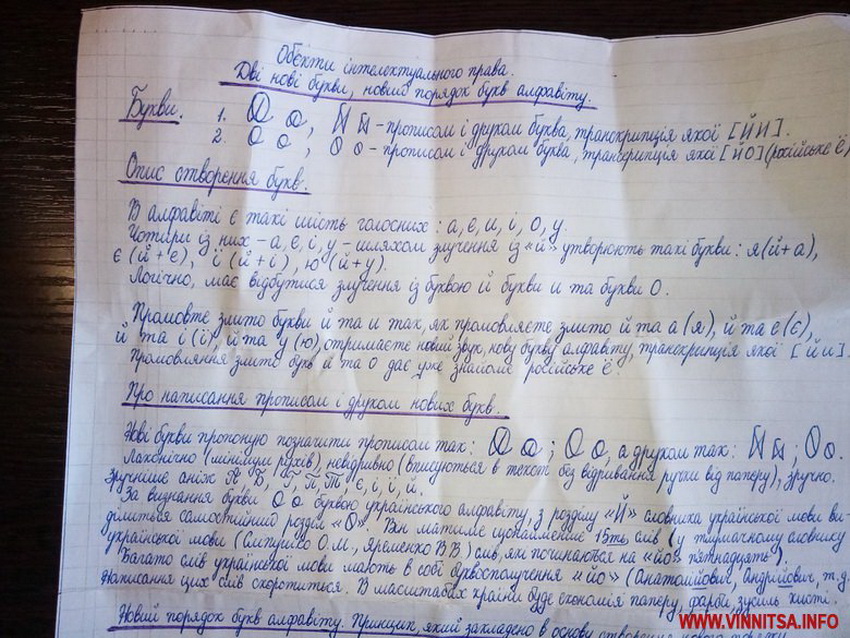 «Звернув увагу, що в алфавіті є такі 6 голосні: а, е, и, і, о, у. Чотири з них – а, е, і, у – шляхом злучення із «й» утворюють такі букви : я (й+а), є (й+е), ї (й+і), ю (й+у). Логічно, має відбитися злучення із Й літери та літери О. Промовне разом дає уже знайоме російське Ё. Ще одне поєднання Й та И, дадуть нову літеру», - зауважує Вінниця.info Лужинецький.