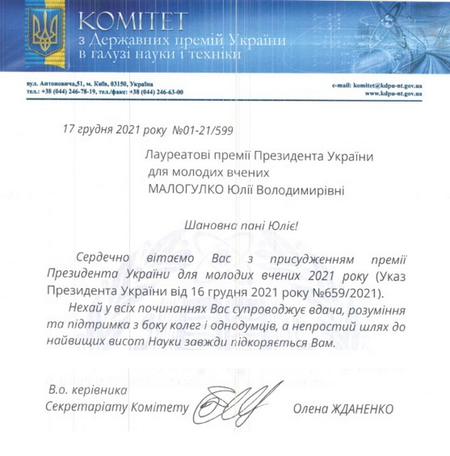 «На підставі подання Комітету з Державних премій України в галузі науки і техніки постановляю присудити премії Президента України для молодих вчених 2021 року», – йдеться в документі.