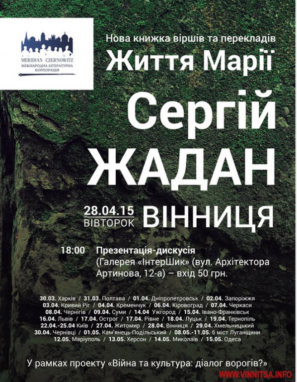 28 квітня Сергій Жадан презентує у Вінниці книгу «Життя Марії». 80 текстів: 60 віршів самого автора і 20 перекладів поезій Чеслава Мілоша.