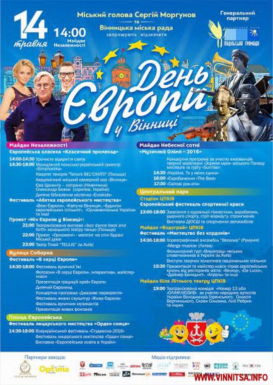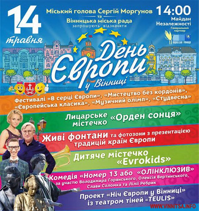 14 травня Вінниця дев’ятий рік поспіль святкуватиме День Європи. Традиційно святкові заходи розміщуватимуться на п’яти локаціях в центрі міста. Вінницька міська рада разом з організаторами підготували насичену програму, яка цього річ повністю завершиться нічними екскурсіями о 3 годині ночі.