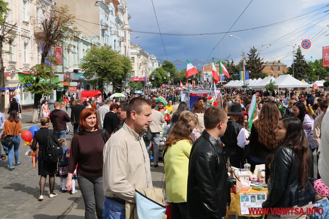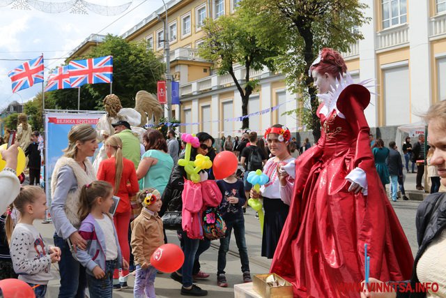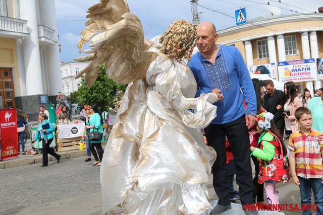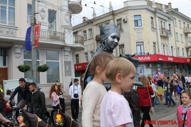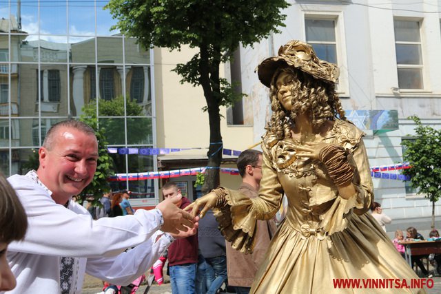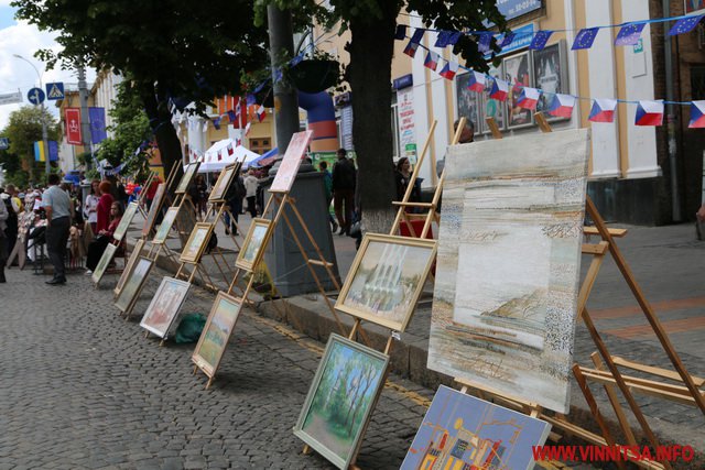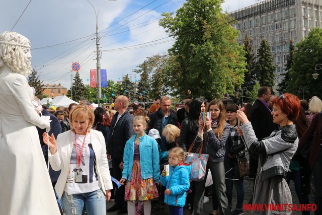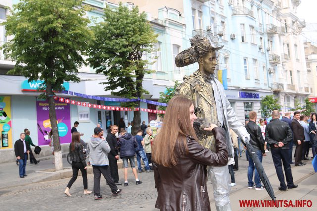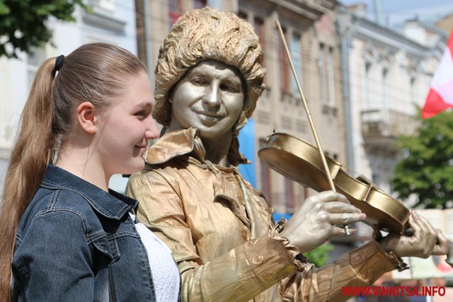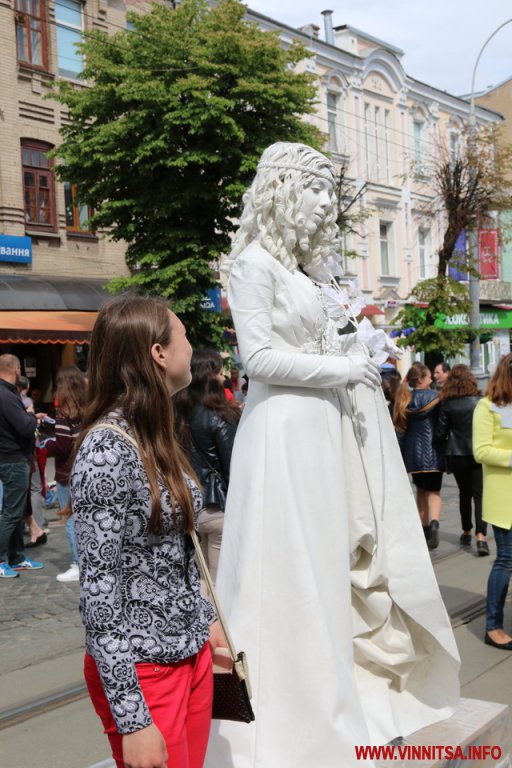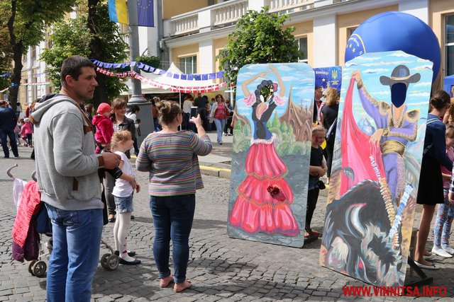 На Соборній від Майдану Незалежності до Театральної - живі статуї, фонтани, картини, майстер-класи, оркестри та музиканти. Вінничани знайомляться з традиціями Європейських країн, зупиняючись біля стендів, де їх зустрічає молодь в традиційному вбранні тієї чи іншої країни.