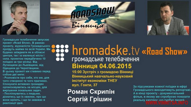 В ефірі «Громадського телебачення» стартує проект Road Show, в рамках якого журналісти Роман Скрипін та Сергій Грішин завітають у Вінницю.