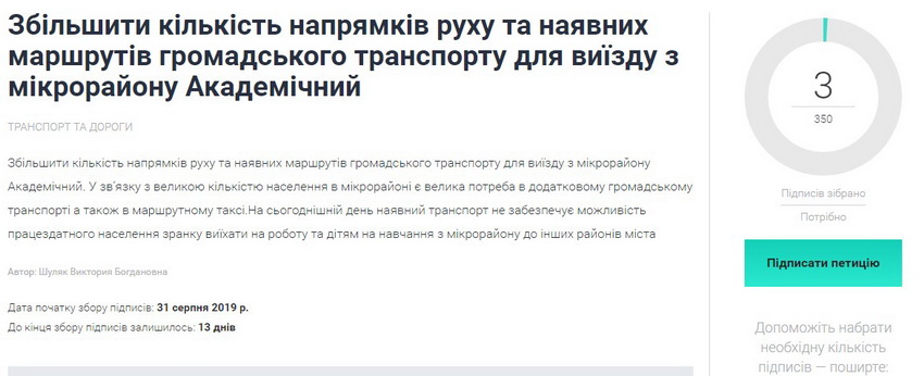 На сьогоднішній день наявний транспорт не забезпечує можливість працездатного населення зранку виїхати на роботу та дітям на навчання з мікрорайону до інших районів міста», – йдеться в петиції Вікторії Шуляк.