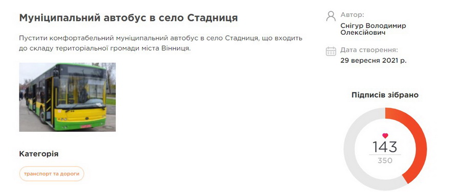Заміна автобусу за напрямком м.Вінниця – с.Стадниця дасть змогу значно підвищити якість транспортного сполучення з даним населеним пунктом, зробить більш комфортним проживання в м. Вінниці та на його околицях, в тому числі людям з обмеженими фізичними можливостями», – йдеться у петиції.