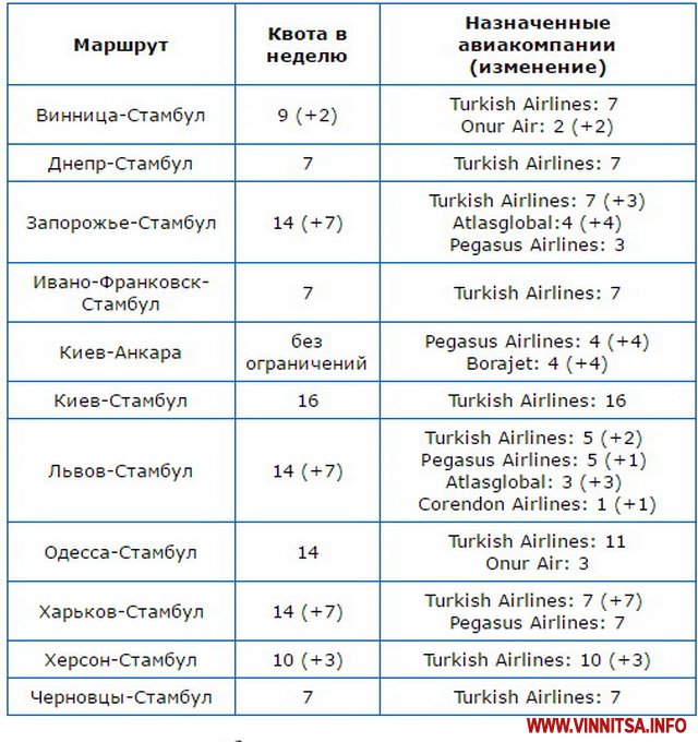 20 січня сайт avianews.com повідомив, що директорат авіації Туреччини повністю розподілив додаткову квоту на польоти в Україну. Зокрема, компанія Onur Air зможе літати зі Стамбула до Вінниці двічі на тиждень.