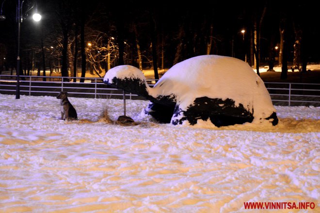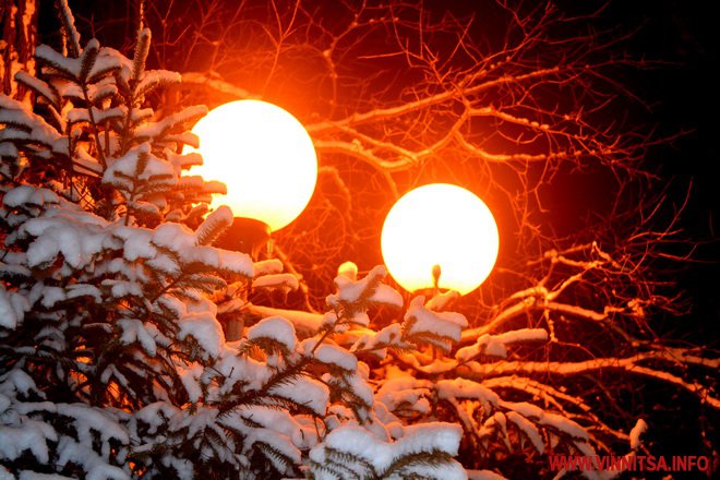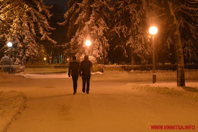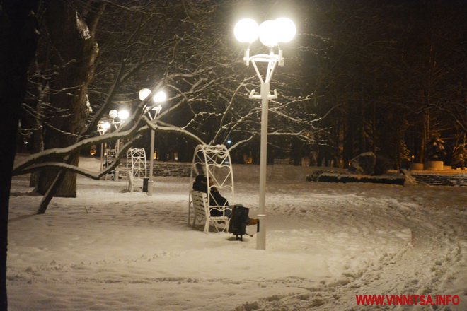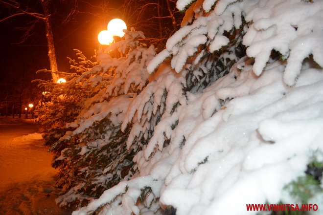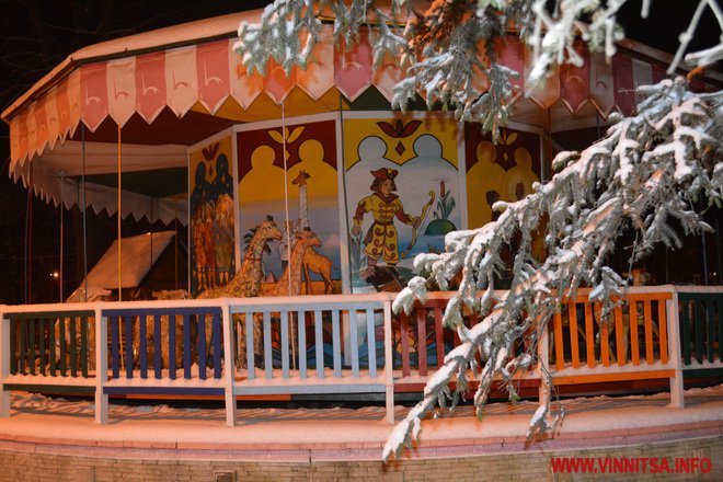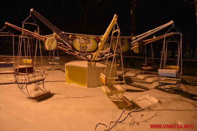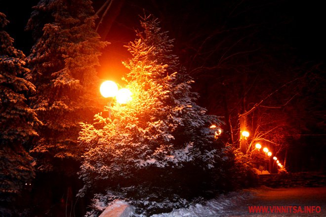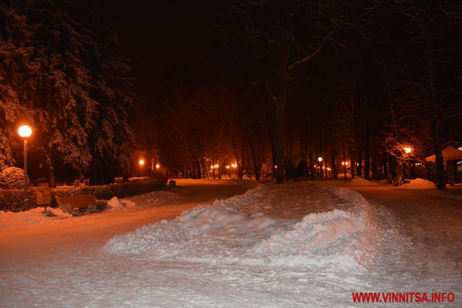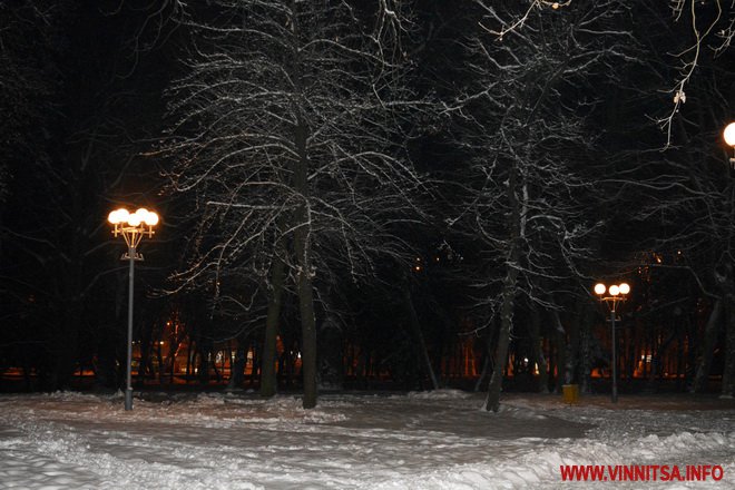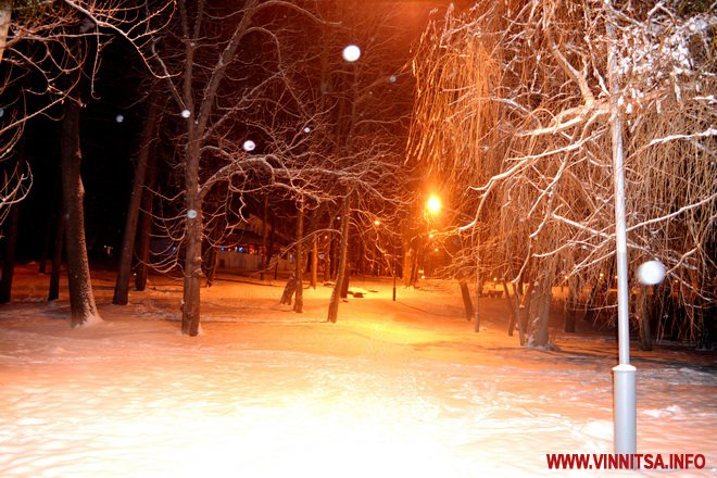 Центральний вінницький парк потонув у снігу. Засипало дерева, атракціони і стежки. Особливо чарівно виглядає він вночі. Десятки ліхтарів заворожують теплим світлом.
