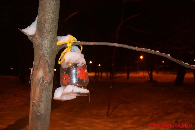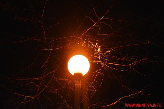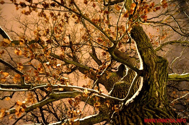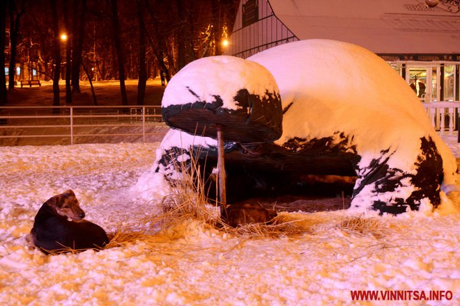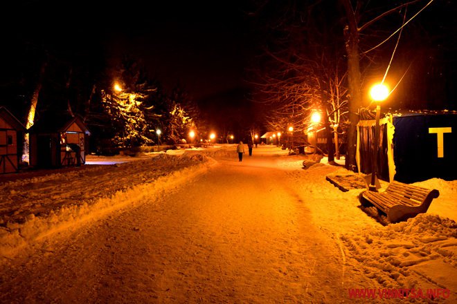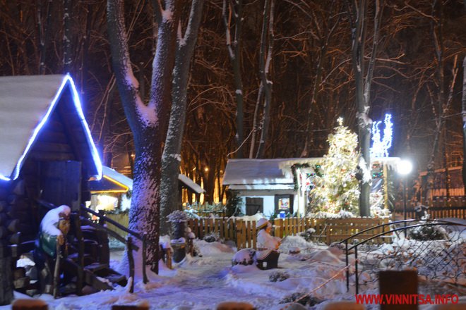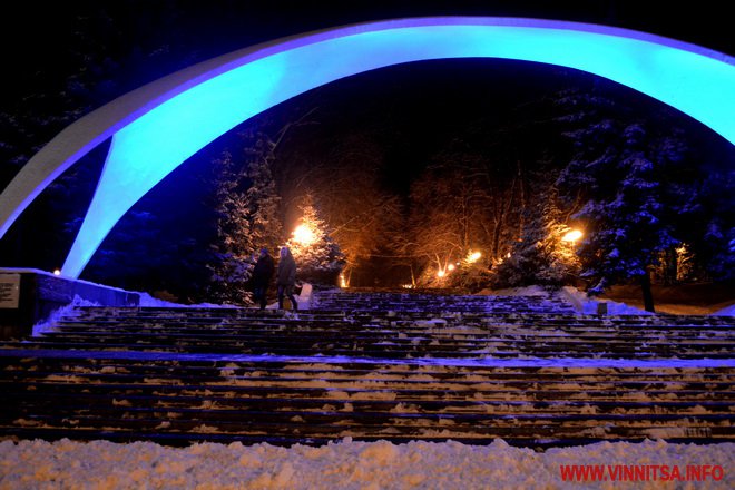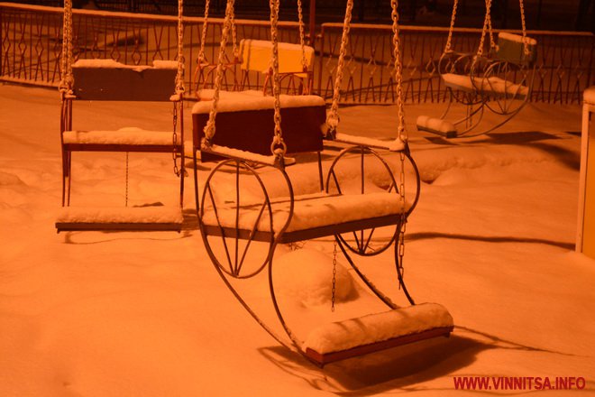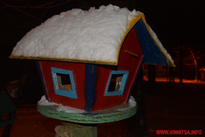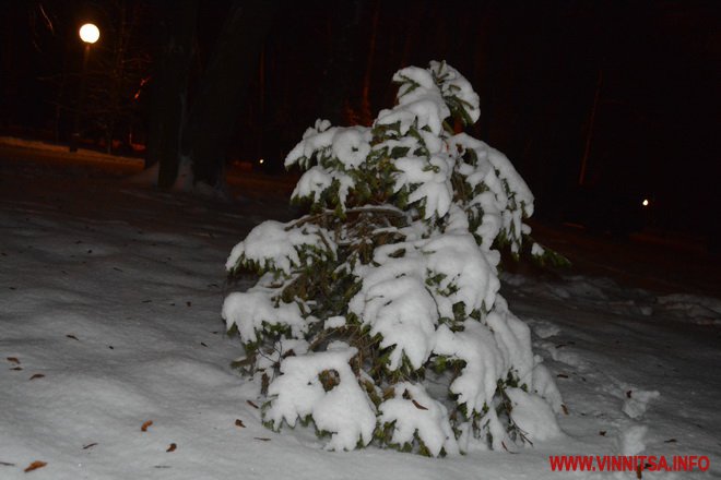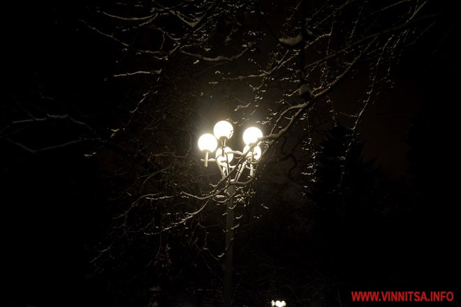 Центральний вінницький парк потонув у снігу. Засипало дерева, атракціони і стежки. Особливо чарівно виглядає він вночі. Десятки ліхтарів заворожують теплим світлом.