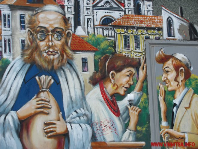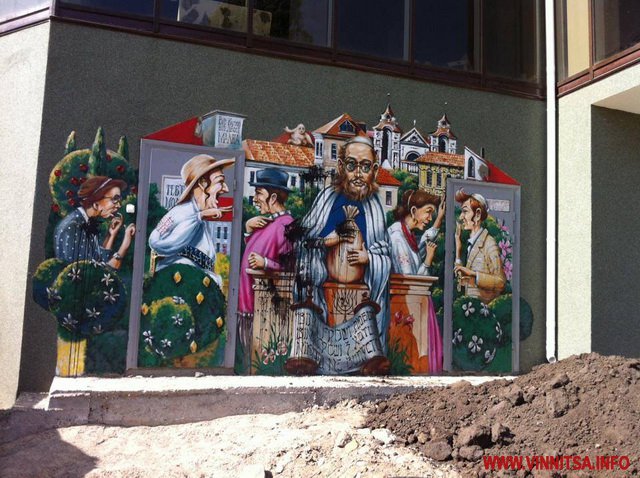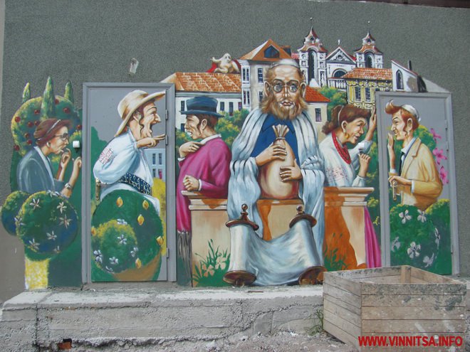 У Вінниці невідомі заляпали смолою різнокольорове графіті із зображенням єврейського побуту, яке розмістили на стіні новобудови на перехресті вулиць Володарського та Шолом-Алейхема.