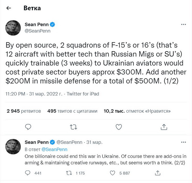 Днями голлівудський актор та режисер Шон Пенн звернувся до мільярдерів світу у своєму Twitter. Він закликав багатіїв витратити 300 мільйонів доларів для на дві ескадрильї F-15 або F-16 для України. А також системи протиракетної оборони вартістю 200 мільйонів доларів. Все разом становило б півмільярда доларів.