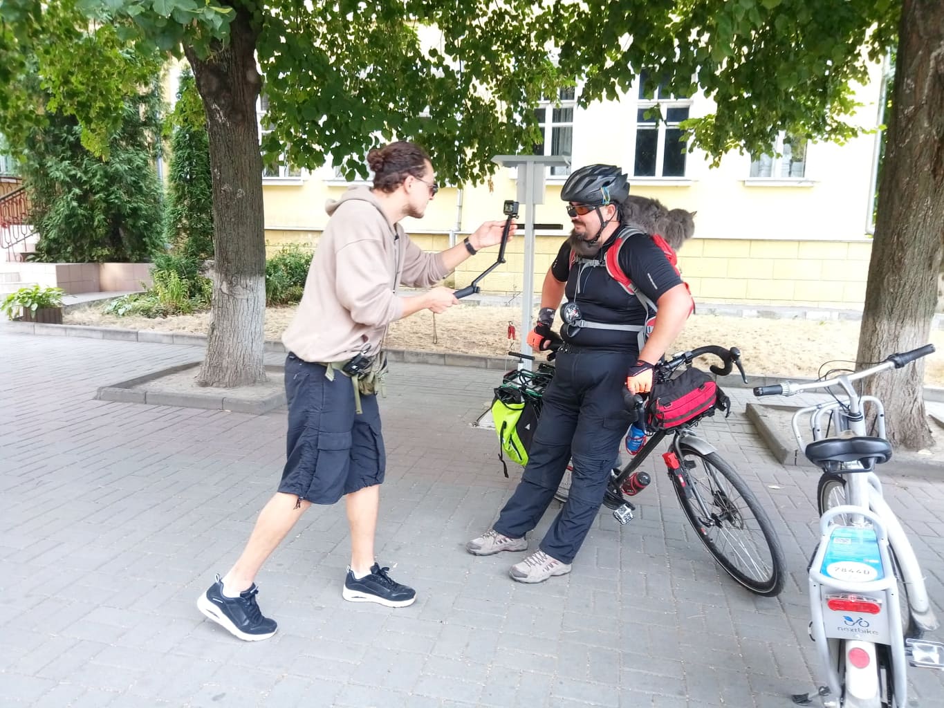 Близько 10 ранку зустрічаємо Синельникова із знімальною групою біля вежі. Разом із вело-активістом Олександром Царевським. Вони ось-ось виїжджають на вело-екскурсію Вінницею. Євген зосереджений. Екшн-камерою фільмує знаменитого кота Коте Царевського. Тварина завжди подорожує на плечах свого господаря.