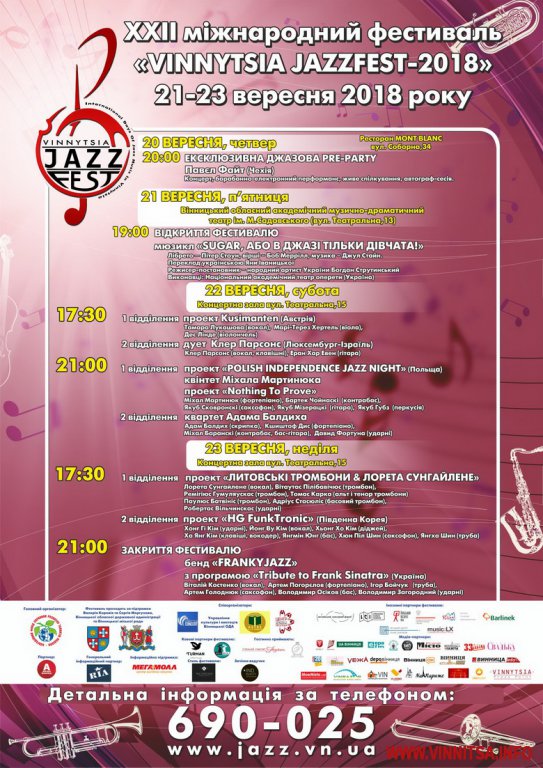 Поспішайте придбати на сайтах http://jazz.vn.ua та http://bilet.vn.ua , у касах Вінниці у ТСК «Магігранд» (10.00-21.00), ТЦ «Петроцентр» (10.00–20.00), театрі імені Садовського (13.00-19.00) та в інформаційному центрі фестивалю, що діє у бібліотеці ім. Тімірязєва (10.00-18.00).